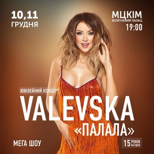 М1 Мьюзик Эвордс — и достойные награды найдут своих владельцев. Юбилейное шоу от ВалевскойЯркая украинская исполнительница Наталья Валевская готовится отпраздновать юбилей своей творческой деятельности. На сцене «Октябрьского» она зажжет настоящий костер со своим шоу «PALALA». Эта песня стала своеобразной визиткой певицы. Но на протяжении 15 лет концепция ее творчества кардинально изменилась и в концертной программе зритель сможет проследить за всеми перипетиями и поворотами.