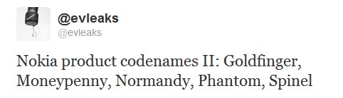 Goldfinger, Moneypenny, Normandy, Phantom, Spinel — "засекреченные" новинки NokiaИзвестный своими публикациями о неанонсированных устройствах twitter-аккаунт @evleaks на своей страничке в сервисе микроблогов сообщил о том, что финская компания Nokia готовит к анонсу сразу пять новых устройств. Девайсы получили кодовые названия Goldfinger, Moneypenny, Normandy, Phantom и Spinel.