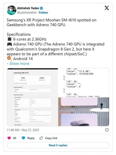 Google і Samsung розкрили процесор своїх XR-окулярівСпільна XR-гарнітура Project Moohan від Google і Samsung отримала перші підтверджені технічні деталі. Завдяки даним із бенчмарка, виявленого інсайдером @yabhishekhd, стало відомо, що пристрій працюватиме на процесорі Snapdragon XR2+ Gen 2 від Qualcomm із 16 ГБ оперативної пам'яті. ОС Android 14 у ньому адаптована для віртуальної та доповненої реальності.