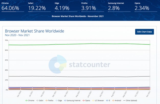 Об этом свидетельствует свежая статистика Statcounter. По состоянию на конец ноября, доля Microsoft Edge впервые в истории превысила 4%. В итоге браузер закрепился на третьем месте по популярности в мире, уступая только Safari и Chrome. Конечно, разрыв между Microsoft Edge и Google Chrome остаётся огромным, и последний в ближайшее время не упадет с первой строчки.