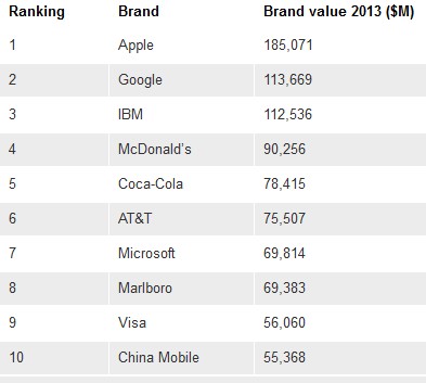 Google и Apple возглавляют рейтинг самых дорогих мировых брендовВ списке самых дорогих брендов мира BrandZ 2013 первая позиция досталась компании Apple, а следом за ней разместилась Google. Агентство Millward Brown Optimor, составляющее рейтинг, оценило Google в $113.669 млрд, в то время как Apple в $185.071 млрд.