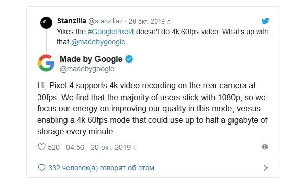 Одной из претензий, которые мы предъявили в адрес недавно анонсированных Pixel 4 и Pixel 4 XL, стало отсутствие возможности записи 4К-видео при 60 кадрах в секунду. Мы связали это с решением не повышать доступный объем встроенной памяти. Отчасти компания это подтвердила в ответе на вопрос одного из посетителей своей странички в Twitter. В сообщении говорится, что «большинство пользователей придерживается формата 1080р», поэтому принято решение усовершенствовать качество в рамках этого формата, а не внедрять 4К@60fps, который «использует полгигабайта памяти на одну минуту». Именно последняя реплика и может говорить о том, что вопрос был как раз по части внутреннего накопителя.