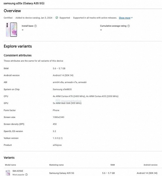 Майбутній смартфон Samsung Galaxy A35 засвітився у каталозі Google Play Console. Крихітне зображення, що супроводжує характеристики, підтверджує опубліковані раніше рендери цієї моделі.