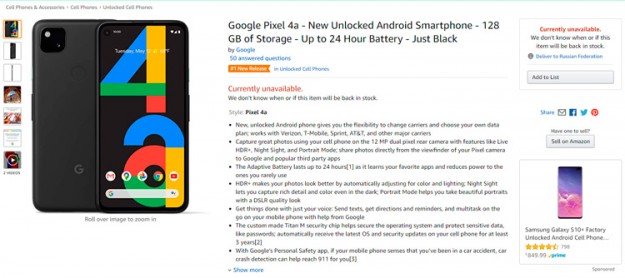 Google Pixel 4a был анонсирован 3 августа, но официально в продажу поступит только 20 августа. Тем не менее, желающие приобрести новинку получили возможность оформить предзаказ. Сделать это можно было не только в Google Store, но и у компаний-партнёров, например Amazon. Последняя начала принимать заказы ещё до анонса Pixel 4a, однако теперь сообщила о дефиците модели.