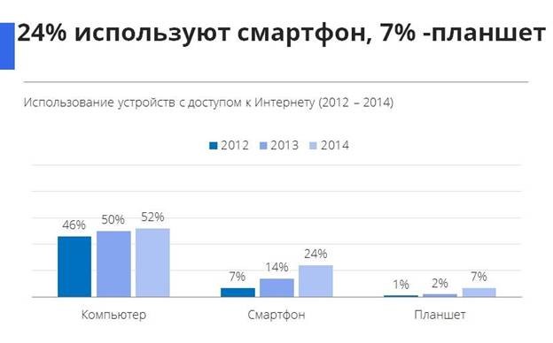 71% украинских пользователей смартфонов входят в Интернет со своего устройства каждый день, по сравнению с 69% с компьютеров и 67% с планшетов. Из них 6% пользуются для доступа в Интернет всеми тремя видами устройств: и компьютером, и смартфоном, и планшетом.