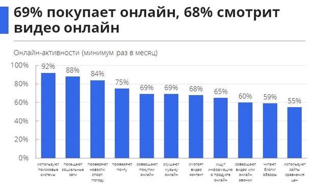 Данные исследования продемонстрировали растущую роль онлайн-покупок, просмотра видео и прослушивание музыки онлайн. Так 69% украинских онлайн-пользователей осуществляли покупки через Интернет, 68% - регулярно просматривают видео онлайн, а 69% слушают музыку через различные онлайн-сервисы.