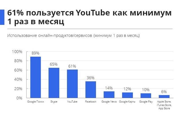 Впервые исследование показало, насколько часто украинцы используют различные сервисы Google. Так, по крайней мере один раз в месяц Google Поиском в личных целях пользуется 89% украинцев, а видео на YouTube регулярно смотрит 61%.