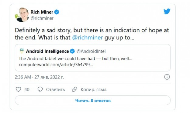 Google, вероятно, снова заинтересовалась планшетными компьютерамиРич Майнер (Rich Miner), один из основателей проекта Android, в настоящий момент участвует в одном из проектов Google, связанном с планшетными компьютерами. Об этом сообщило издание ComputerWorld в материале, посвящённом планшетным компьютерам Google; ещё одно подтверждение нашлось на странице господина Майнера в LinkedIn — с марта прошлого года он занимает должность технического директора по Android-планшетам в подразделении «Платформы и экосистемы».