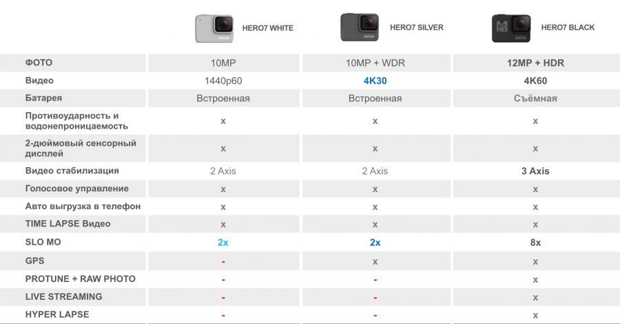 GoPro Hero 7 представлена официально. Цена для Украины20 сентября GoPro представила сразу три камеры новой линейки: Hero7 White, Hero7 Silver и Hero7 Black, удовлетворяющие постоянно растущие потребности пользователей экшен-камер: сенсорный экран, защиту от воды без дополнительного бокса и возможностью съемки в портретном режиме для публикаций в социальных сетях и трансляций в режиме реального времени. Все представленные модели сохранили ключевые преимущества камер GoPro — компактность, прочность и простое управление, делающих их исключительными. Линейка GoPro Hero7 предлагает лучший выбор покупателям экшен-камер из трех современных моделей. GoPro Hero7 White — удобство съемки и сенсорный экран по доступной цене, GoPro Hero7 Silver — простоту в работе, высокую производительность, включая съемку в разрешении 4К, поддержку GPS и наложение телеметрии на фото и видео. GoPro Hero7 Black — лучшую на рынке экшен-камеру с потрясающей производительностью, трехосевой стабилизацией изображения, съемкой 4К на скорости 60 кадров в секунду и возможность ведения трансляций в Facebook в режиме реального времени. GoPro Hero7 Black: бескомпромиссное качество для тех, кто хочет получить все и сразу — новый уровень стабилизации видео, стриминг видео, новый режим SuperPhoto Новые возможности GoPro Hero7 Black делают ее лучшей экшен-камерой в мире и желанным инструментом профессионалов: новейшая стабилизация изображения HyperSmooth на уровне Karma Grip и новые режимы съемки — TimeWarp, представляющий собой ускоренный Time Lapse со стабилизацией, SuperPhoto, обеспечивающий улучшенную цветопередачу снимков, распознавание сцен и долгожданная возможность ведения прямых трансляций в Facebook. GoPro Hero7 Black оснащена 12-мегапиксельной матрицей, поддерживает HDR, 8-кратный Slo-mo и трехосевую стабилизацию видео. Рекомендованная розничная цена в Украине 16 499 гривен.