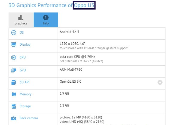 Готовится к анонсу Oppo U3 с 64-битным 8-ядерным MediaTek MT6752В базе данных бенчмарка GFXBench был замечен не представленный еще официально смартфон Oppo U3 на базе 64-битного процессора MediaTek. Согласно данным тестера, новинка оснащена 4.6-дюймовым дисплеем с разрешением 1920x1080 пикселей, 2 ГБ оперативной памяти и 64-битным процессором MediaTek MT6752, в основе которого 8 ядер Cortex-A53 с тактовой частотой 1.7 ГГц и графика Mali-T760 с поддержкой Open GL ES 3.0 и Open CL 1.