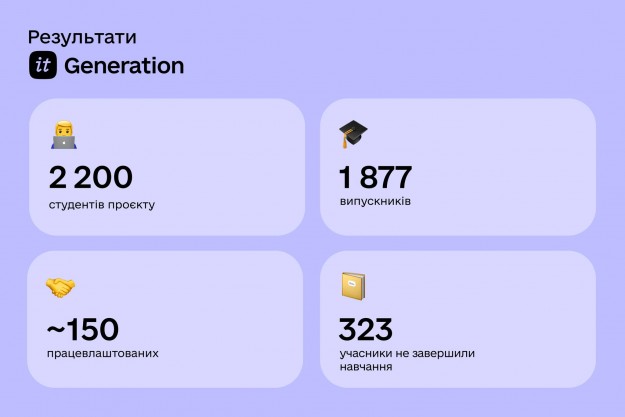 Готуємо ІТ-спеціалістів. Освітній проєкт ІТ-Generation завершеноІT Generation — це проєкт Мінцифри у партнерстві з Binance Charity та Львівський ІТ Кластер. Його мета — дати безоплатну ІТ-освіту людям, які хочуть змінити фах чи спробувати себе в новій сфері. У проєкті взяло участь 2200 людей з усієї України.
