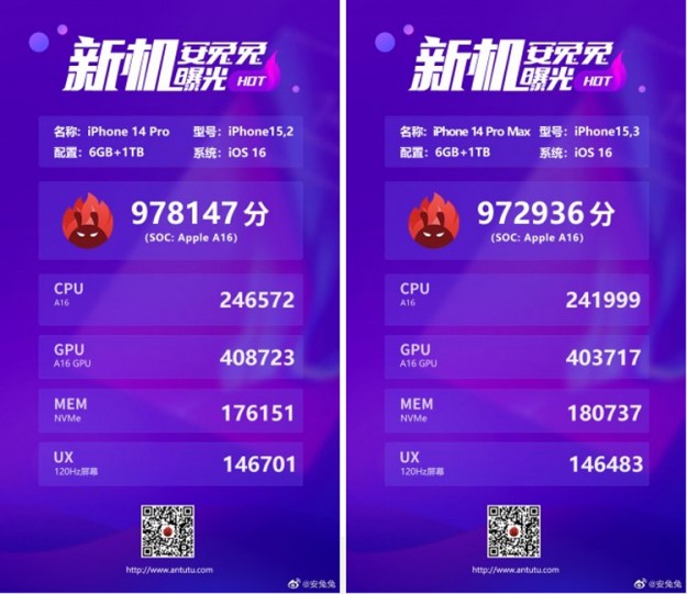Модели iPhone 14 Pro и iPhone 14 Pro Max по сравнению с предшественниками демонстрируют прирост быстродействия CPU-ядер на 17 %, памяти — на 10 %. Что касается графического узла, то его производительность поднялась более чем на четверть — на 28 %.