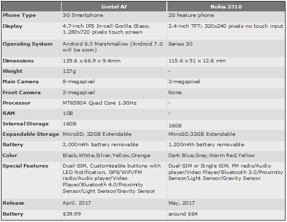 В отличие от Nokia 3310, который при ценнике в $64 лишен операционной системы Android, Wi-Fi модуля, поддержки 3G, селфи-камеры и большого экрана, Gretel A7 работает под управлением ОС Android 6 с последующим обновлением до Android 7, поддерживает работу в сетях 2/3G, оснащен 2Мп фронтальной камерой и 4.7-дюймовым HD-экраном от JDI, прикрытым 2.5D-стеклом Gorilla Glass. Среди прочих преимуществ Gretel A7 над Nokia 3310: LED-индикатор, аккумулятор на 2000 мАч, поддержка двух SIM-карт, 8Мп основная камера с сенсором Samsung 3H7, автофокусом и светодиодной вспышкой.
