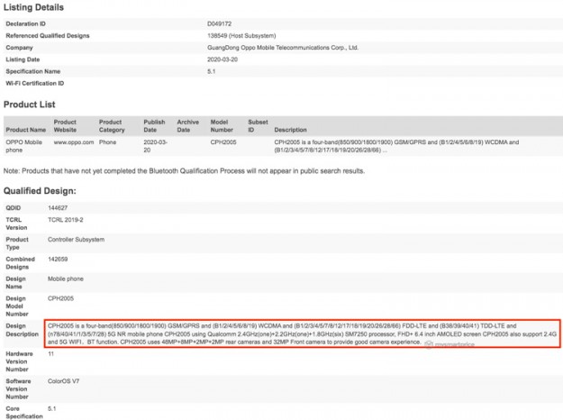 Кроме того, сообщается, что на сайте организации Bluetooth SIG «засветился» смартфон OPPO с обозначением CPH2005. Эта модель получит процессор Snapdragon 765G, обеспечивающий поддержку сетей 5G.
