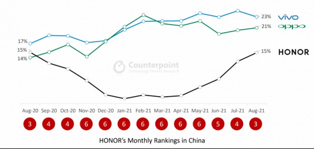 Honor удалось обойти Xiaomi на крупнейшем рынке смартфоновПо итогам августа Honor входит в тройку ведущих брендов на рынке Китая Согласно данным Counterpoint Research, в августе 2021 года компании Honor удалось превзойти Xiaomi по объему продаж смартфонов в Китае и стать третьим по величине брендом на этом рынке. Всего за месяц продажи смартфонов Honor в Китае выросли на 18%, что является одним из лучших показателей роста.