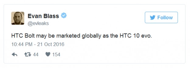 HTC Bolt выйдет на международный рынок как HTC 10 evoСегодня благодаря twitter-аккаунту @evleaks стало известно о том, что готовящийся к анонсу в США смартфон HTC Bolt выйдет на международный рынок под названием HTC 10 evo.