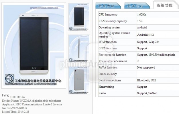 HTC Desire 816 выйдет на рынок с ОС Android 4.4.2 KitKatАнонсированный в рамках всемирно известной выставки электроники MWC 2014 фаблет HTC Desire 816, как стало известно благодаря документам китайской сертификационной организация TENAA, выйдет на рынок с операционной системой Android 4.4.2 KitKat на борту.