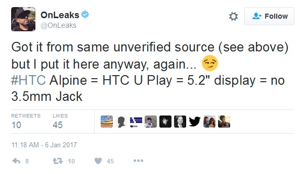 HTC готовит к анонсу смартфоны U Play и U UltraТайваньская компания HTC, как сообщает twitter-аккаунт @OnLeaks, в рамках запланированного на 12 января 2017 года мероприятия представит два смартфона новой U-серии.