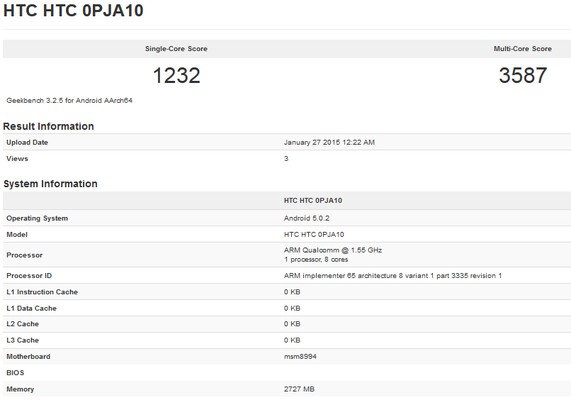HTC One (M9) замечен в Geekbench с 64-битным 8-ядерным Snapdragon 810В базе данных бенчмарка Geekbench 3.0 засветился не анонсированный еще смартфон тайваньской HTC с индексом OPJA10, который является главным претендентом на звание нового флагмана производителя One (M9). Среди спецификаций новинки в тестере указан 64-битный 8-ядерный процессор Qualcomm Snapdragon 810 MSM8994 с графикой Adreno 430, а также 3 ГБ оперативной памяти и ОС Android 5.0.2 Lollipop. HTC One (M9) набрал в одно- и многоядерном режиме тестирования 1232 и 3587 балла соответственно, в то время как замеченный ранее в этом же бенчмарке Samsung Galaxy S6 c фирменным Exynos 7420 "на борту" показал результат в 1520 и 5478 набранных очков. Напомним, согласно последним данным, One (M9) получит от производителя 5-дюймовый дисплей с разрешением 1080x1920 пикселей, аккумулятор на 2840 мАч, 13Мп фронтальную камеру и 20Мп основную с возможностью записи 4K-видео, а также системами автофокусировки и оптической стабилизацией изображения. Анонс HTC One (M9) ожидается 1 марта. Джерело: SmartPhone.ua Обговорення новини