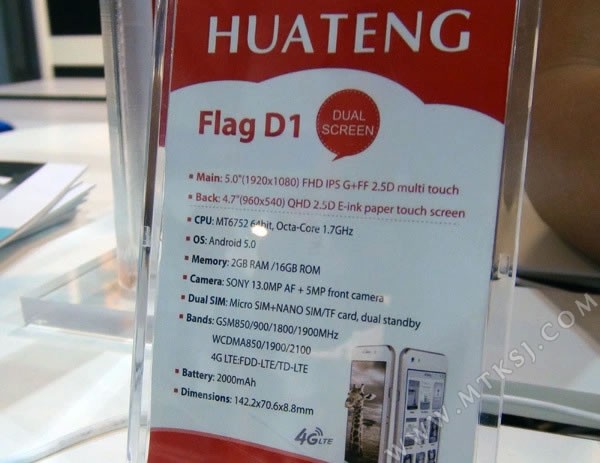 Huateng Flag D1 — YotaPhone-подобный смартфон с поддержкой dual-SIM за $320В Китае состоялся анонс очередного бюджетного конкурента YotaPhone — смартфона Huateng Flag D1 с двумя экранами, один из которых выполнен по IPS-технологии, а второй по технологии электронных чернил E Ink.