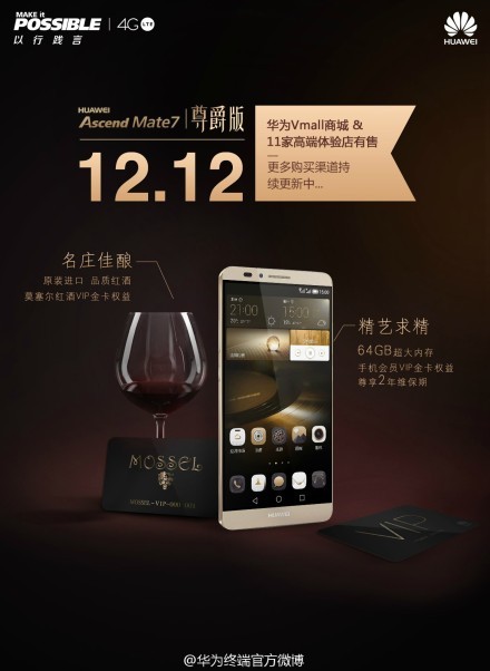 В остальном аппараты идентичны: 6-дюймовым Full HD LTPS IPS-дисплей с разрешением 1920х1080 точек, фирменный 8-ядерный чип Kirin 920 (4 ядра Cortex A7 с частотой 1.3 ГГЦ и 4 ядра Cortex A15 с частотой 1.8 ГГц), графика Mali-T628, 2/3 ГБ ОЗУ, 5Мп фронтальная камера и 13Мп основная, аккумулятор на 4100 мАч, беспроводные модули Wi-Fi 802.11a/b/g/n, DLNA, Bluetooth 4.0, NFC, GPS c A-GPS и ГЛОНАСС, а также ОС Android 4.4 KitKat с фирменной оболочкой EMUI 3.0 "из коробки". Huawei Ascend Mate 7 Monarch доступен в золотистом цвете корпуса по цене $710. При покупке смартфона покупатель получит в подарок бутылку вина Mossel и карту VIP-клиента Huawei. Пока неизвестно, появится ли смартфон за пределами Китая. Джерело: SmartPhone.ua Обговорення новиниГость: Лопатафон какой то , будиш как дурак с ним , больше 5.5 дюймов за глаза . Попередні новини