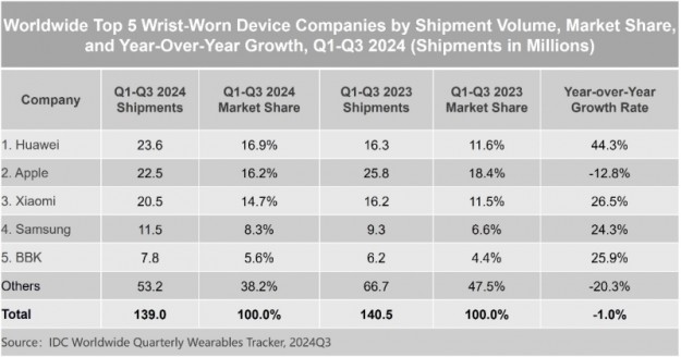 До слова, обсяги поставок розумних годинників Apple Watch, як єдиного виду пристроїв марки для носіння на зап'ясті, за підсумками трьох кварталів цього року знизилися на 12,8 %, а частка американської компанії на світовому ринку скоротилася з 18,4 до 16,2 %. При цьому Huawei рік тому посідала друге місце з 11,6 % ринку, лише злегка випереджаючи Xiaomi з її 11,5 % ринку. Остання тепер задовольняється третім місцем і 14,7 % світового ринку, але її обсяги поставок зросли на пристойні 26,5 % до 20,5 млн пристроїв. Apple за три квартали цього року поставила 22,5 млн пристроїв, а Huawei вирвалася в лідери з 23,6 млн пристроїв, що носяться на зап'ясті.