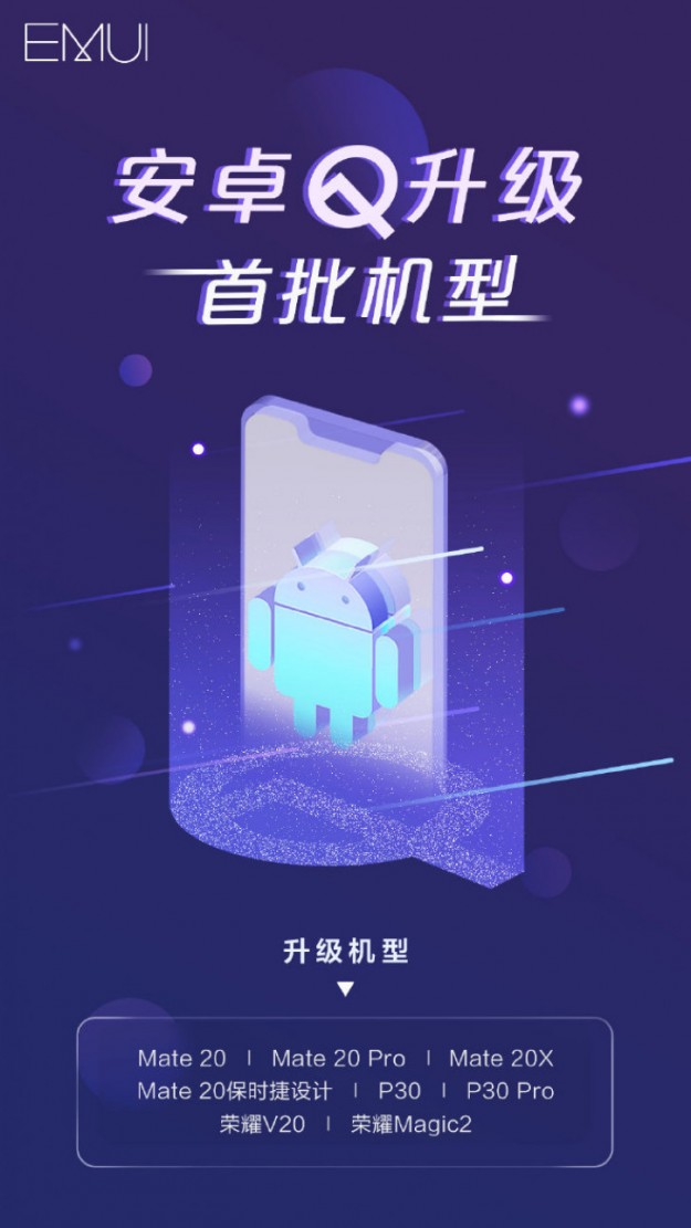 Huawei пообещала быстро обновить ключевые смартфоны до Android QНа этой неделе прошла конференция Google I/O, в рамках которой компания вновь заговорила об Android Q – следующем поколении мобильной ОС. Подхватила тему и Huawei, которая довольно внимательно относится к вопросу поддержки своих устройств. В китайских социальных сетях опубликовано сообщение о том, что компания планирует максимально быстро обновить свои ключевые устройства после релиза финальной версии Android Q. В обозначенный перечень вошли актуальные модели Huawei и Honor на чипсете Kirin 980, а именно: Huawei Mate 20, Mate 20 Pro, Mate 20 X, P30, P30 Pro, Honor V20 (он же View 20) и Magic 2.