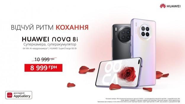 Huawei влюбляет: скидки на гаджеты ко Дню святого ВалентинаПодразделение Huawei Consumer Business Group в Украине объявляет акцию на ряд продуктов ко Дню святого Валентина. Украинцы смогут приобрести технику Huawei — от смартфонов до игровых мониторов — по специальным ценам. Гаджеты поддерживают инновационные технологии и множество удобных функций и станут надежными технологическими помощниками для вас и ваших близких. Акционные цены на устройства Huawei распространяются на смартфоны nova 8i, планшеты MatePad T10 и MatePad T10-S FHD, ноутбуки MateBook D14 и MateBook 14s, игровой монитор MateView GT 27'', смарт-часы Watch 3 Pro Classic, Watch GT 3 Black 6, а также наушники FreeBuds 4 и FreeBuds 4i. Смартфон с квадрокамерой Особенность Huawei nova 8i — мощная система камер с искусственным интеллектом и сверхбыстрая зарядка Huawei SuperCharge на 66 Вт. Так, смартфон заряжается на полную за 38 минут, а для зарядки до 60% нужно всего 17 минут. Суперкамера nova 8i включает 64 Мп основную и 8 Мп ультраширокоугольную камеру, а также 2 Мп макрокамеру и 2 Мп сенсор глубины. Кроме того, смартфон поддерживает Dual SIM и имеет 6,67-дюймовый безрамный дисплей для комфортного просмотра контента.