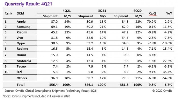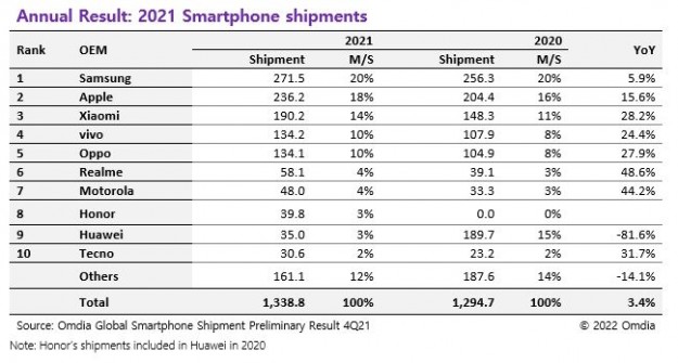 Huawei вылетела из топ-10 рынка смартфонов. Ее обогнали Tecno и itelИсследовательская компания Omdia опубликовала свой отчёт по мировому рынку смартфонов в четвёртом квартале 2021 года. Этот документ интересен большим охватом: Omdia публикует не топ-5 крупнейших игроков рынка смартфонов, а топ-10. Так вот, даже этот отчёт больше не включает Huawei: компания продала меньше смартфонов, чем занявшие 9 и 10 место Tecno и itel, бренды компании Transsion. Впрочем, в рейтинге представлена Honor; она занимает седьмое место — между Realme и Motorola. Ну а лидером по итогам предновогодних месяцев стала Apple, продавшая 87 млн смартфонов — это даже больше, чем вся BBK (Vivo, OPPO и Realme на троих продали 78,9 млн устройств).