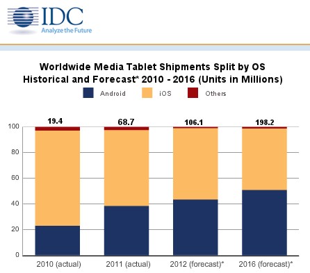 IDC: планшеты на Android обгонят iPad в 2015 годуНесмотря на продолжающийся рост популярности планшетов под управлением Android и увеличение их веса на рынке, компания Apple вкупе с iPad сохранит доминирующие позиции в данном сегменте, по меньше мере, еще пару лет. Об этом свидетельствует официально обнародованный прогноз IDC, согласно которому Android-планшеты смогут опередить в плане доли мирового рынка своего “яблочного” конкурента на базе iOS в 2015 году. Впрочем, если рассматривать такой показатель, как выручка от продаж, iOS-планшеты будут впереди Android-аналогов даже в 2016 году и более далекой перспективе.