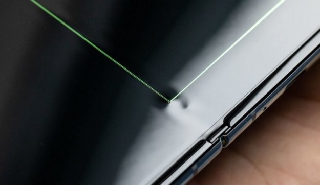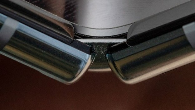 Также для OLED-дисплея весьма опасна пыль. Как видно по фотографиям The Verge, сделанным ещё до того, как их образец Galaxy Fold сломался, в области петель у смартфона есть довольно крупные зазоры, в которые попадает пыль. Как отметили некоторые обозреватели, спустя какое-то время под дисплеем в районе изгиба появилась выпуклость (на фото ниже), а у некоторых даже не одна. Они становятся заметны при полностью разложенном дисплее. Интересно, что у одного из обозревателей «шишка» через какое-то время исчезла — по всей видимости пыль или мусор вывалились из-под дисплея. Конечно же, наличие пыли или другого мусора под дисплеем давит на него изнутри и может привести к поломке.