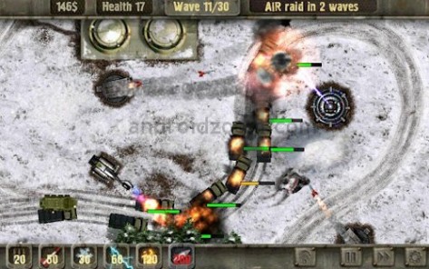 Итак, имеется набор из десяти доступных игровых локаций (пустыня, зимняя местность, лес и так далее). Через каждую карту пролегает извилистая дорога, по которой будут двигаться войска противника, то есть их маршрут всегда заранее известен. Видны и траектории полета авиации неприятеля. Рельеф сложен, на картах есть и всяческие руины, и возвышенности, так что располагать свои орудия можно не везде. Исходя из таких факторов и нужно выстраивать оборону. Доступных сооружений шесть штук, среди них и пулемет, и огнемет, и «замораживающая» пушка, и мощная артиллерия. Каждая турель может быть дважды улучшена. Денег за уничтожение врагов дается сравнительно немного, так что постоянно придется выбирать: «прокачать» текущую пушку или купить еще одну. Думать приходится быстро, так как скорость движения противников относительно высока.