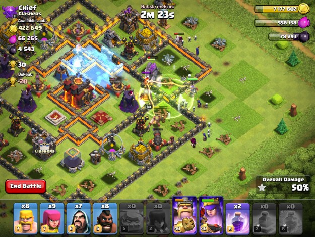 В центре поседения стоит самое главное здание, и оно должно быть максимально защищенным. Вокруг него можно стоить стену, она защищает от врагов. Укрепление нужно постоянно улучшать, тратя на это не такие уже и доступные ресурсы. Поверьте, стена играет очень важную роль. Самое главное здание добавляет новые здания, например, золотые шахты. Есть на территории хранилище золота и отдельное строение для хранения эликсира. По всему кругу строим башни и ставим пушки. Если есть возможность, строим башни колдунов. Делать это нужно равномерно справа и слева. Если чувствуете, что готовы, то можно нападать на других участников или на соседние фермы офлайн. Выбираем деревню, нападаем, разрушаем. Фармить золото и эликсир – вот наша задача. За счет этого будем расти и сами. Бывает, что и на вас нападают. Начало битвы – пришли лучники, гиганты, все хотят прорваться внутрь. Если есть ангел, то они восстанавливают жизнь гигантов, а это не очень хорошо. Гиганты мощная сила, которых тяжело убить. Чтобы получить победу урон должен быть не менее 50 %. Специальные воины могут грабить вас, а потом разрушают хранилища. Победитель получает все трофеи. Победитель может получить еще и дополнительного строителя. А это хорошо, когда их много. Так быстрее строятся и улучшаются здания. Улучшая военный лагерь мы поднимаем силу своих воинов, а значит сможем быстрее разрушать соперников.