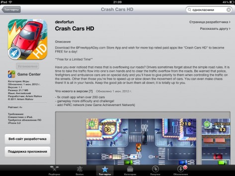 Играем на iPad: Crash Cars HDИгра из категории «на выживание», где игрок – регулировщик на одном из перекрестков с интенсивным движением транспорта. Цель – максимально долго уберегать свой перекресток от аварий! Количество авто увеличивается с каждой секундой, скорость передвижения возрастает… Но как же не погибнуть!? В App Store игра распространяется совершенно бесплатно. Никаких скрытых покупок не предусмотрено.