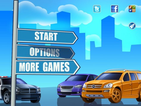 Что же касается игры, нею управляют иконки START, OPTIONS, а также MORE GAMES. Последний из подразделов как таковой интересует не сильно. Перейдя сюда, пользователь получает доступ к странице разработчика игры, где помимо Crash Cars HD расположены и другие «творения»!