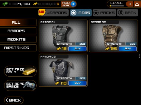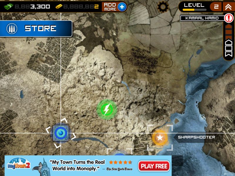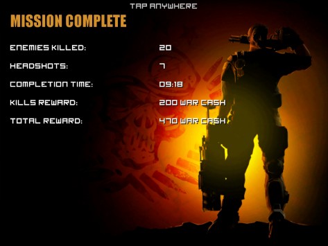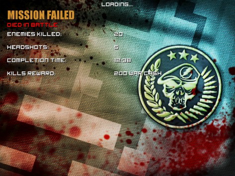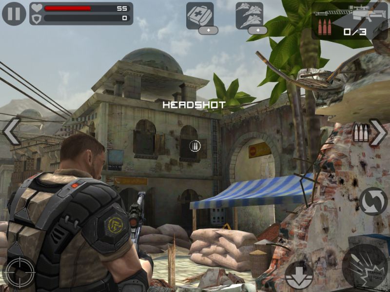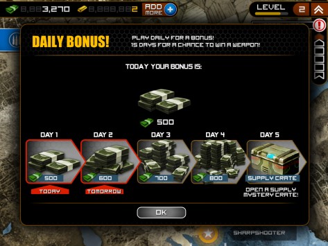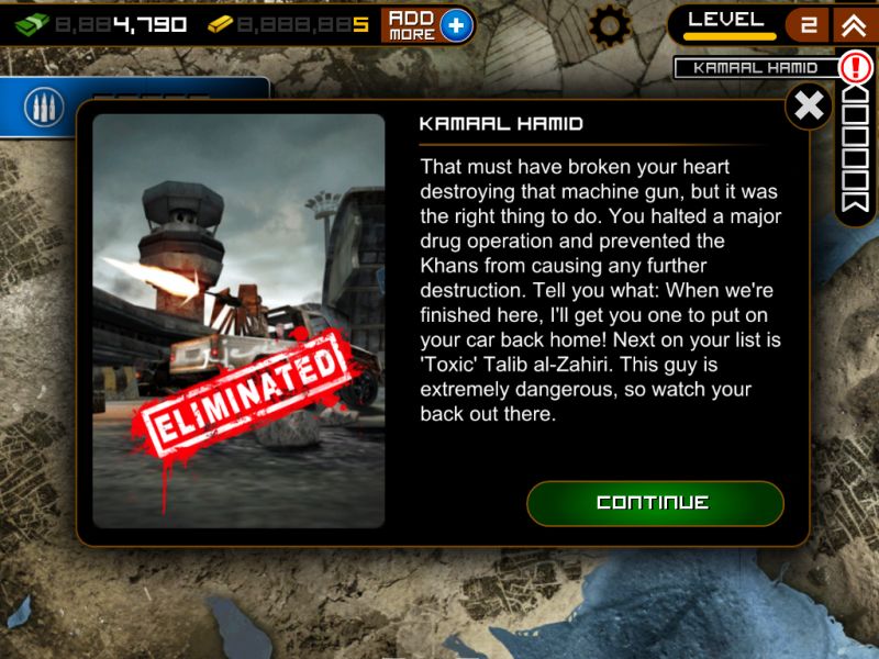 Каждый уровень отмечен несколькими заданиями, которые, в свою очередь, все до единого выносятся на некую импровизированную карту, как мне показалось, отображающую регион «Персидской залив». Военные действия, куда отправляется персонаж игрока, обозначаются на карте соответствующими пиктограммами. Стоит отметить, что некоторые задания в конкретный момент могут быть недоступными для выполнения. Для этого придется вначале выполнить задания в других игровых секторах, после чего доступ будет открыт. Изначально, скажем так в арсенале пользователя три своего рода запасные жизни. Кроме того, он может задействовать некоего помощника в виде налета авиации союзников. Эту манипуляцию можно также проделывать трижды. Стоит отметить при этом, что ни первое, ни второе не возобновляется автоматически – его придется только покупать. Расплачиваться можно либо же заработанными за время игры золотыми слитками, либо же некоторыми другими вариантами, к примеру, наличными долларами, докупая необходимую опцию. Что касается себя, потратив все жизни и помощь авиации уже на первом уровне, пополниться я смог только на третьем. Но что бы дойти до него, понадобилось почти два полных дня (с небольшими перерывами на еду и сон), и масса увертливости. Впрочем, я не виню себя, за то, что так долго пристреливался. Во-первых, пройти не так легко, а во-вторых, мне самому было очень интересно. Каждый день пользователь получает автоматический денежный бонус за посещение игры. Размер его увеличивается не пропорционально, что, конечно же, приятно. Впрочем, отмечу сразу, что за деньги в Frontline Commando можно покупать только оружие, тогда как те же жизни, как помним, только за золотые слитки. По мере выполнения заданий и прохождения уровней персонажу предоставляется не только денежная награда, но и различные бонусы/скидки на покупку того или иного вида оружия. Таким образом, как видим, разработчики всячески стимулируют игрока не останавливаться на достигнутом. Пройдя конкретное задание, система впоследствии предлагает выполнить его снова. Отдельные сценарии усиливаются, к примеру, передвижным транспортным средством, которое нужно остановить, убив как водителя, так и стрелка за пулеметом или мини-пушкой. Причем здесь уже на время. Если за конкретное количество минут, машинка осталась, что говорится, на ходу, а стрелок у орудия, или же просто машинка на ходу, даже без стрелка и время истекло, вы проиграли. Конечно – это при том, если вас не убьют террористы раньше, чем закончится время! Убить и водителя и пулеметчика вполне реально, но опять-таки придется пристреливаться. В первой своей стычке, лично я проиграл. Зато уже по второму кругу террористу на авто пришлось худо. Другие примеры, скажу так, «усиления» могут быть представлены гражданскими людьми, которых убивать нельзя. Ошибся, застрелил женщину - равно проиграл. Так что бдительность не помешает. А еще мне понравилось, когда персонажа обстреливают моджахеды из гранатометов. Их нужно убивать, и при этом продержаться определенное время. Вы выиграли, убив максимально много (четких рамок нет), террористов, но если при этом умудритесь остаться в живых. На каждом уровне, есть свое «Элитное» задание. То есть, то, которое пройти простому смертному не получится! Не переживайте – это шутка. Победить здесь, конечно же, все можно, однако 