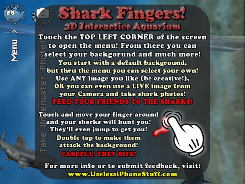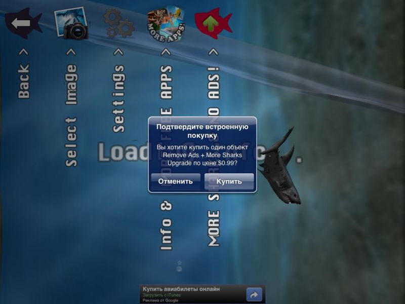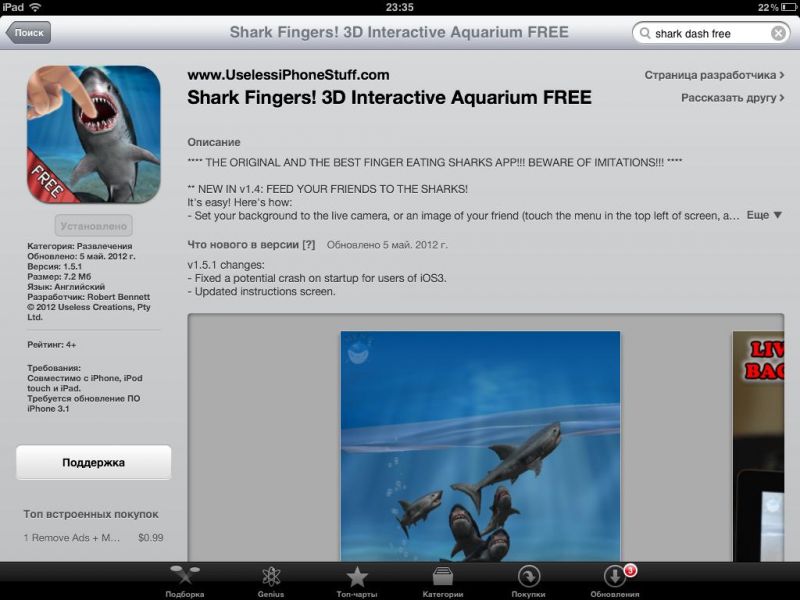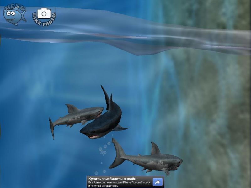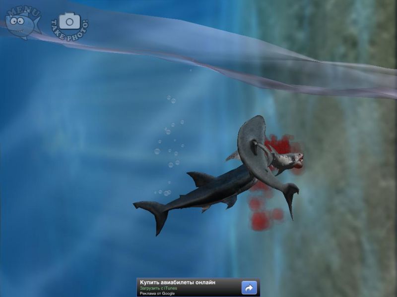 Играем на iPad: Shark Fingers! 3D Interactive Aquarium FREEХотите ткнуть пальцем в рот акуле, «украсить» весь бассейн своей кровью, но при этом остаться в целости и невредимости!? Тогда эта простейшая и «милая» игрушка именно то, что вы искали. В App Store рассматриваемое игровое приложение распространяется бесплатно, однако вместе с тем, необходимо сразу же отметить – имеется скрытая, или же, как в магазине ее «по-доброму» называют, встроенная покупка. Тратить или нет лишний доллар на дополнительную опцию, о которой я упомяну ниже, решать каждому из будущих игроков, как говорится, самостоятельно. Я же, в свою очередь, прекрасно обходился и без необходимости покупки. Объем дистрибутива игры занимает всего 7,2 МБ. При наличии стабильного подключения 3G или Wi-Fi (смотря опять-таки, чем богат ваш iPad, и что вы предпочитаете использовать), загрузка с автоматической установкой приложения занимает все несколько десятков секунд – уж точно не более полуминуты. Запустив игру, игрок окажется на виртуальном дне океана, где помимо, разумеется, песка, разломов породы и прочее, увидит также и несколько «зубастиков», «шныряющих» в поисках добычи. Для того, что бы вас укусили, нужно некоторое время с периодичностью один раз в секунду касаться дисплея пальцем, но делать это нужно так, что бы пальцем попадать как раз акулам по зубам. В конечном итоге, каким-бы увертливым не был ваш палец, в зубки к рыбкам он все равно таки попадет, и если до этого акулы были относительно спокойны, то после того, как они вас укусят, они начинают приходить в бешенство и метаться в разные стороны. Игрок же, со своей стороны теперь уже может передвигаться по всему экрану, оставляя, правда, при этом кровавые отметины. Несколько минут таких передвижений покрасят все это виртуальное море в красный оттенок. Что же относительно «встроенных покупок», речь идет о приобретении большего количества акул, чем предусмотрено разработчиками изначально. Кроме того, за те же 99 центов, система уберет рекламу, которая присутствует в данной игре. Лично же я повторюсь, не нуждался в такого рода «приобретении», а потому ничего не покупал. Тем не менее, о вкусах, как принято говорить, не спорят. Но это игровое приложение было бы очень скучным, если бы не получило несколько простых, но в тоже время любопытных подпунктов настроек. Кликнув на иконку, обозначенную, как MENU, пользователь, тем самым активирует четыре подраздела меню. Начнем с последнего. Подпункт More Sharks & NO Adds отвечает собственно за встроенную покупку, о которой уже упоминалось выше. Второй из подпунктов – MORE APPS предоставляет возможность ознакомиться с другими разработками конструктора игры Shark Fingers! 3D Interactive Aquarium FREE. Что же относительно подменю Setting. Перейдя сюда, пользователь может регулировать уровень воды в своем виртуальном океане, активировать некие голографические часики, что бы не пропустить какое-либо важное событие, или же, проще говоря, не заиграться. Здесь же можно включить и выключить звук, а также включить или выключить режим крови. Откровенно говоря, лично мне кажется такой подпункт не очень уместным в данном случае, поскольку кровь в этой игре это как своего рода одна из фишек. Очевидно, сборщик подключил все возможные этические мотивы, потому и сделал своего рода оговорку! И, наконец, последний подраздел. Здесь мне кажется, интереснее всего. В данном раз