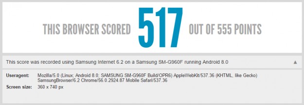 В базе данных бенчмарка HTML5test появился смартфон Samsung Galaxy S9. Браузер Samsung Internet 6.2, запущенный на устройстве с индексом SM-G960F и операционной системой Android 8.0 Oreo, набрал 517 баллов из 555 возможных. Отметим, что это оценка не производительности устройства, а того, насколько корректно браузер интерпретирует исходный код веб-страниц. Поэтому из всех характеристик смартфона HTML5test публикует только логическое разрешение экрана – у Galaxy S9 оно составляет 740х360 точек. Это соответствует соотношению сторон 18,5:9 – такому же, как у нынешнего флагмана Samsung Galaxy S8. Это означает, что следующий топовый аппарат в линейке корейского производителя, также получит экран Infinity Display. Джерело: Mobiltelefon.Ru Обговорення новиниКоментариев пока никто не оставил. Станьте первым! Попередні новини