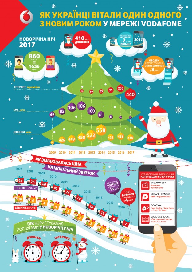 Инфографика от Vodafone: Как украинцы поздравляли с Новым ГодомЗимние праздники - традиционно пиковый период для телекоммуникационных сетей. Нынешние не стали исключением: абоненты Vodafone отправили десятки миллионов поздравительных сообщений, передали сотни терабайт поздравлений по сети Интернет и осуществили сотни звонков. Цифры действительно впечатляют. Например, одних только новогодних разговоров хватит на 1636 лет непрерывного общения. Детальнее смотрите на инфографике, которая размещена на сайте Vodafone: Джерело: SmartPhone.ua Обговорення новиниТрофим КИев: Ого какие разговорчивые... Думаю в среднем по европам скромнее будет Депутат: То я цсіх поздоровляв. Виборців своїх. СМСсочку їм закинул і фоточку з Балі. Хай подивляться, шо люди вибрали. Nikolay: ого , и это все в перерывах между оливье и шампанским)) Попередні новини