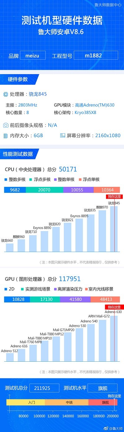 Инфографика подтвердила технические характеристики Meizu 16Технические характеристики Meizu 16 уже известны в общих чертах, однако новые подтверждения продолжают поступать. Китайские источники опубликовали инфографику бенчмарка Master Lu по модели M882 (именно этот модельный номер приписывают новому флагману) со следующими техническими характеристиками: дисплей с разрешением 2160 х 1080 точек, чипсет Snapdragon 845 с 8 ядрами Kryo по 2,8 Ггц и графическим чипом Adreno 630, 6 ГБ оперативной памяти. Как и полагается бенчмарку, приведены результаты синтетики и сравнение с другими чипами. В отличие от AnTuTu, где нет цифр производительности ОЗУ и пользовательского интерфейса, а также не подается информация по камерам. Эта и другая информация будет озвучена официально 8 августа.