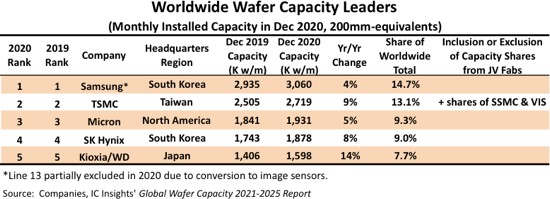 Декабрьской статистикой делится агентство IC Insights. Расстановка сил по критерию количества обрабатываемых ежемесячно кремниевых пластин в эквивалентном типоразмере 200 мм за год не изменилась, но признаки усиления консолидации отрасли наблюдались. Во всяком случае, пять ведущих компаний по сравнению с декабрём 2019 года увеличили свою долю с 53 до 54 %.