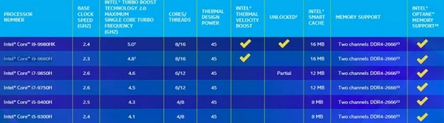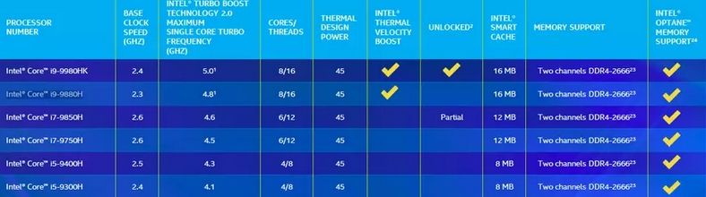 Вот характеристики мобильных процессоров Intel Core 9-го поколения: