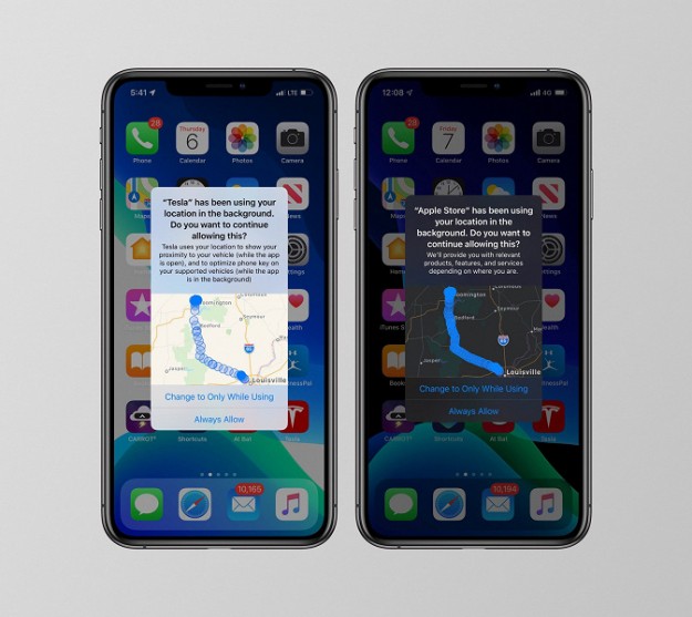 Чтобы держать пользователя в курсе, iOS 13 выводит всплывающие уведомления, когда приложение фиксирует местоположение в фоновом режиме. В уведомлении также отображается карта данных о местонахождении, отслеживаемых конкретным приложением. На приведенных снимках экрана показаны данные о местоположении, отслеживаемые приложением Tesla, а также приложением Apple Store.