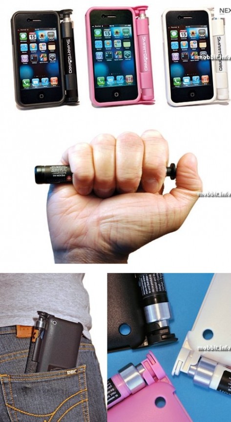 Данное устройство имеет говорящее название Smartguard (смарт-охранник) и представляет собой обыкновенный пластиковый чехол для iPhone, но к нему сбоку пристроен держатель для баллончика с перцем, который используют при встрече с недоброжелателем. Устройство крепления баллона сделано так, что не произойдет самопроизвольного распыления. Для использования нужно вытащить баллончик из крепления, направить распылителем в лицо преступнику и нажать на кнопку.