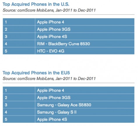 iPhone — самые продаваемые смартфоны в США в 2011 годуВ данном случае речь идет о iPhone 3GS, iPhone 4 и iPhone 4S. Согласно данным статистики, опубликованным comScore в четверг, эти модели были самыми популярными смартфонами в США в прошлом году. В своем докладе Mobile Future in Focus аналитики comScore также привели весьма интересные цифры: iPhone 4 и 3GS заняли первые строчки в списке самых продаваемых смартфонов в Великобритании, Франции, Германии, Италии и Испании. На третьем и четвертом местах оказались Samsung Galaxy Ace S5830 и Galaxy S II, а на пятом — iPhone 4S.
