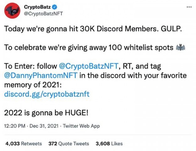 Например, один из твитов от CryptoBatz со старой ссылкой, опубликованный 31 декабря 2021 года, получил более 4000 ретвитов и сотни ответов. Его удалили 21 января, после того, как ресурс The Verge предупредил сообщество CryptoBatz.