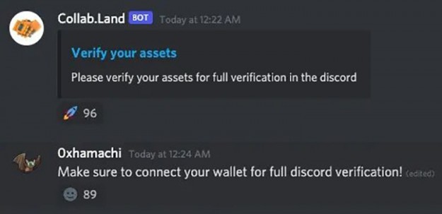 Бот, имитирующий службу управления сообществом Collab.Land, предлагал пользователям подтвердить свои криптоактивы, перенаправляя пользователей на фишинговый сайт, где им предлагалось подключить свои криптовалютные кошельки.