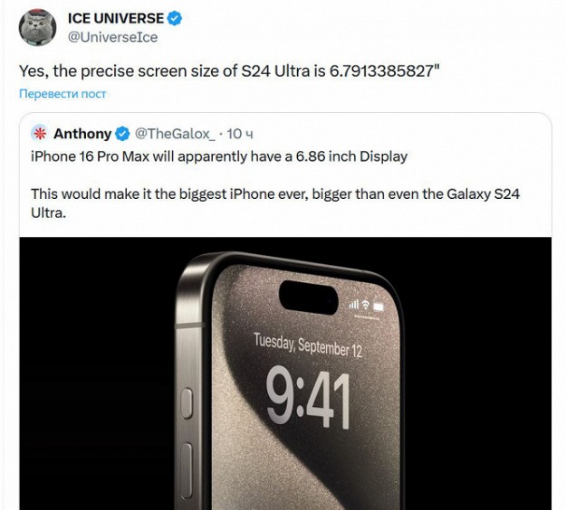 Инсайдер, известный под ником Ice Universe, отметился очень интересным сообщением в соцсети Twitter: он назвал размер экрана будущего флагмана Galaxy S24 Ultra с точностью до десятого знака после запятой.