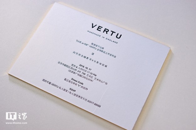 Vertu разослала китайским журналистам приглашения на анонс своего следующего смартфона, который состоится в Китае уже 17 октября в 20:00 по местному времени (15:00 МСК). Мероприятие пройдёт под лозунгом «Live or Die». Приглашение, по всей видимости, разослано компанией Vertu Telecommunications Trading China – некогда китайским локальным офисом Vertu, ставшим самостоятельной компанией после банкротства Vertu Corporation. Это означает, что новинка не имеет никакого отношения к бывшему подразделению Nokia и имеет китайское происхождение.