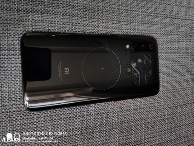 Хорошо видно, что задняя панель является прозрачной, как у Xiaomi Mi 8 Explorer Edition, на который кстати и сделаны фотографии. Кроме того, смартфон оснащен возможностью беспроводной зарядки.